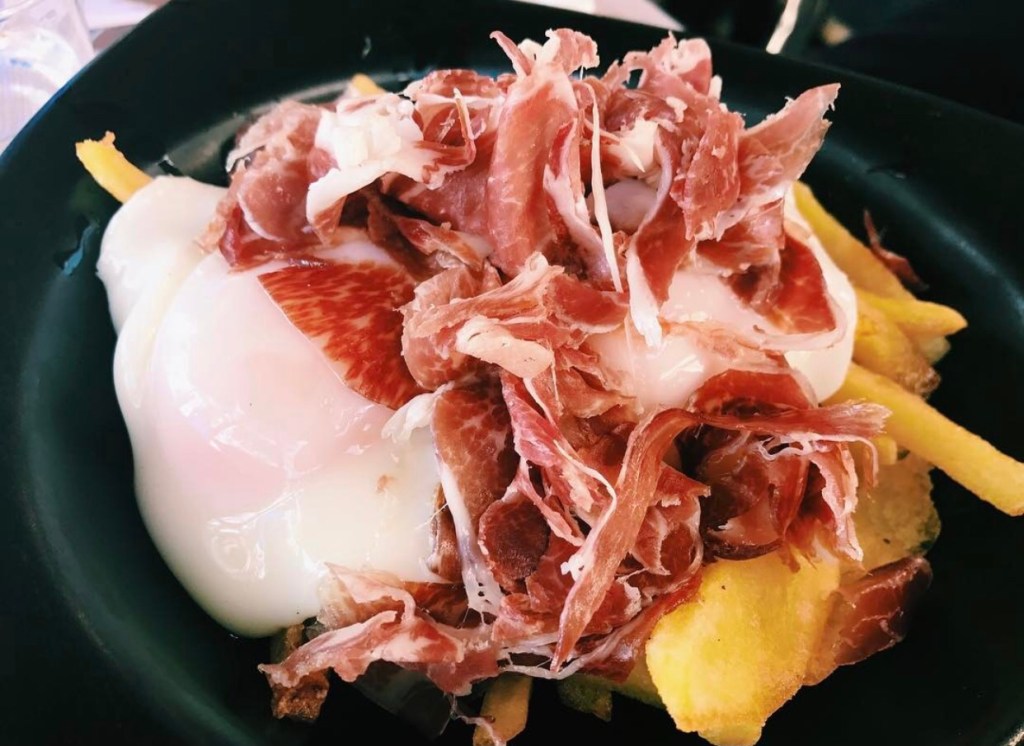 Uno de mis platos favoritos de este restaurante son los clásicos huevos estrellados con patatas y jamón ibérico