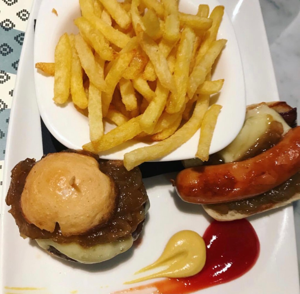 Lo que viene a continuación es uno de los platos más cutes que últimamente no puede faltar en la mesa cuando como en Vinitus. SÍ! Te estoy hablando de la «Mini hamburguesa con queso y cebolla» y el «Mini frankfurt». A ambos les doy un 10 de 10, no solamente por la presentación, que es maravillosa, sino que el sabor que estos tienen es aún mejor, y mira que es difícil…